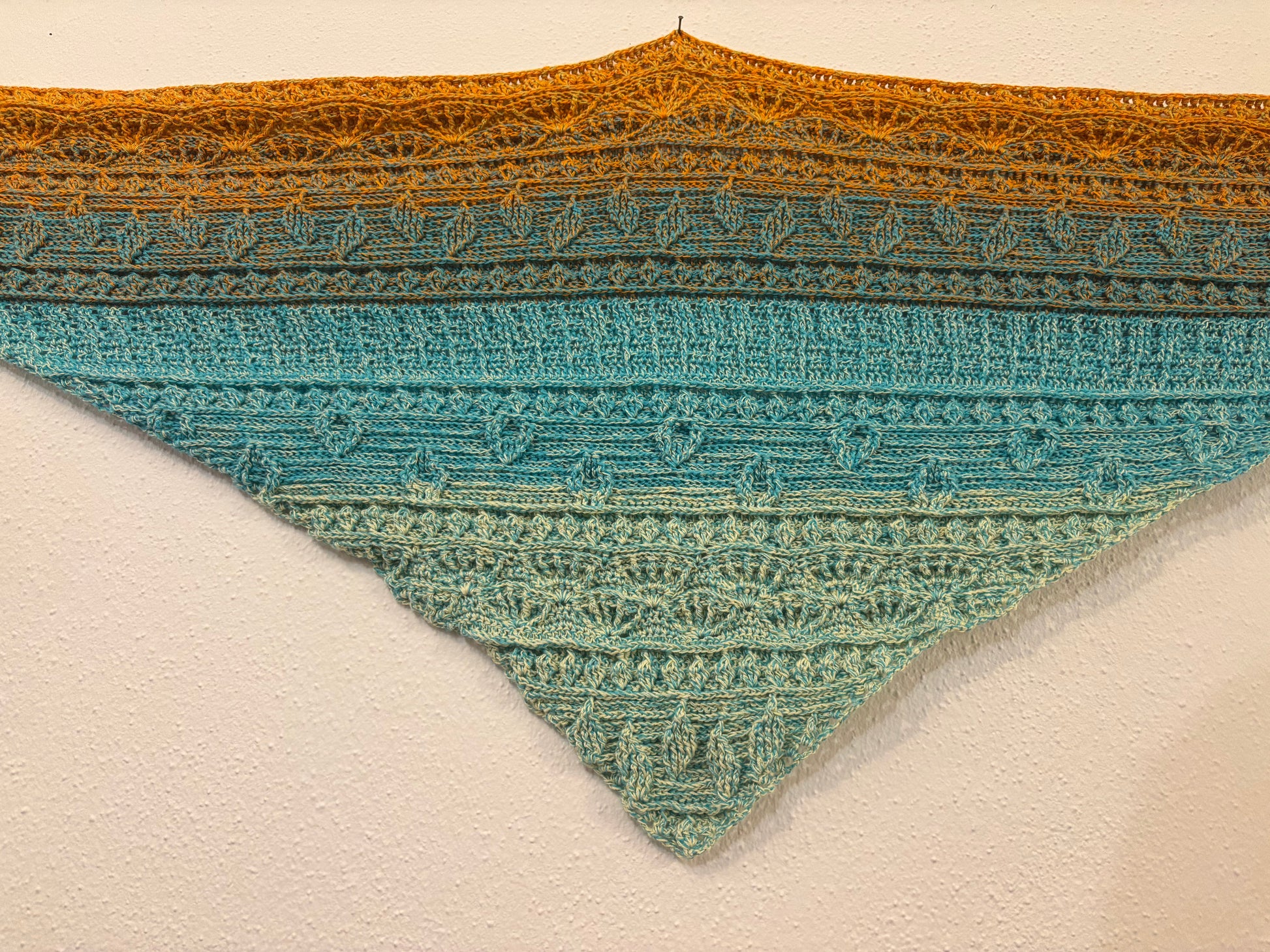 vie ist ein Dreieckstuch, das von der unteren Spitze in Reihen nach oben gehäkelt wird. Nach jeder Reihe wird es gewendet. Die Zunahmen befinden sich am Reihenanfang und am Reihenende. Der Farbverlauf entwickelt sich von unten nach oben.